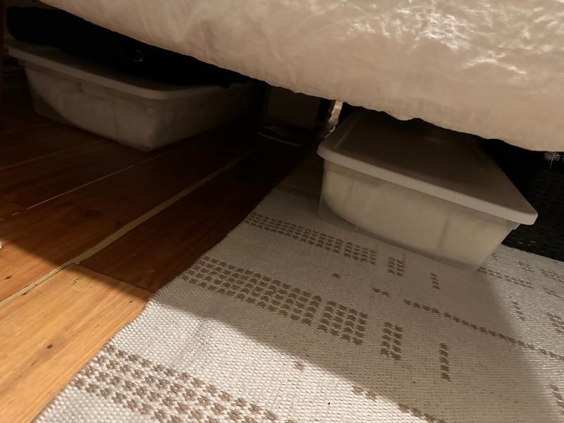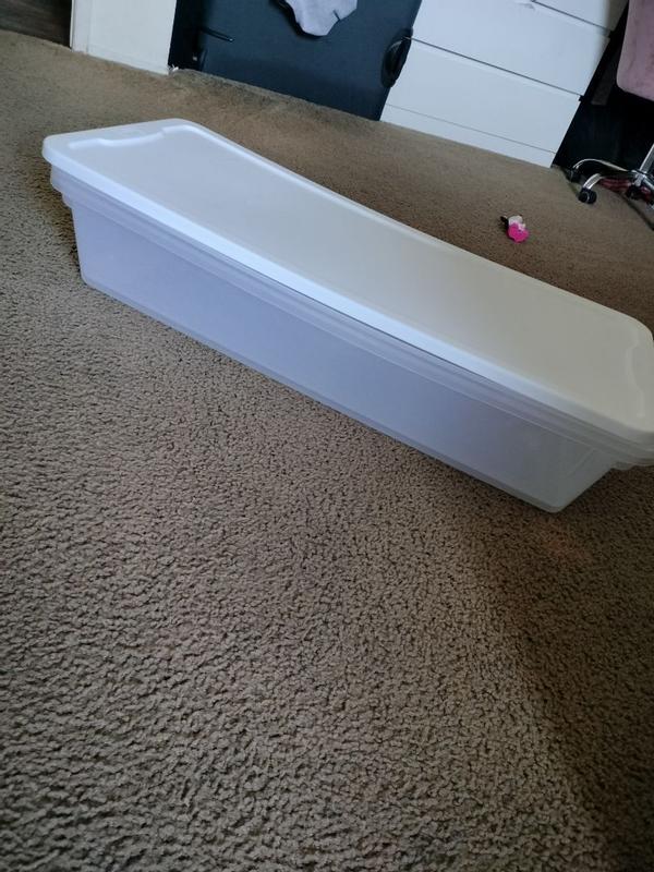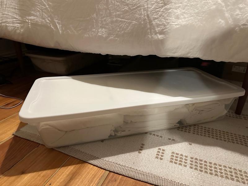 The width of this bin is great for fitting underneath a bed but not taking up too much room. The quality is durable and sturdy. Really great bins for whatever you need to store!