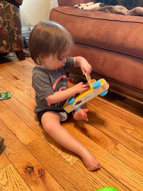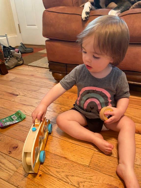 Perfect for our one year old pal! Love the simple colors and the wheels!