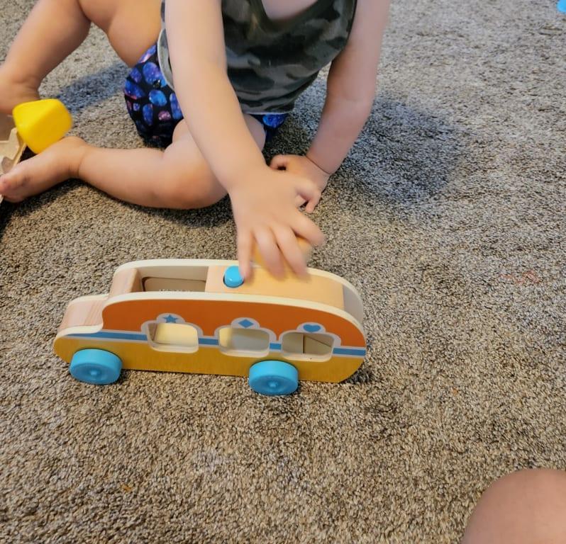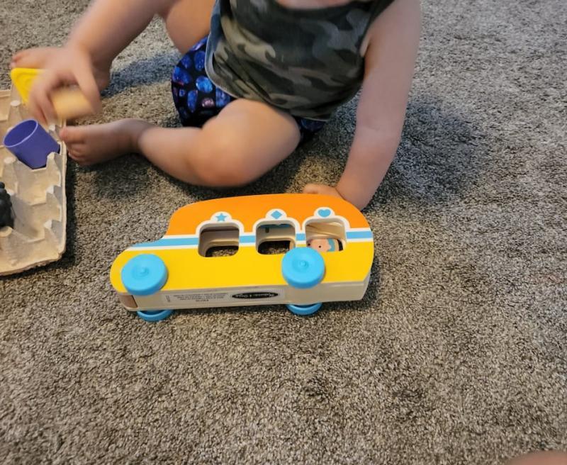 My granddaughter loves this.She sees her brother get on a school bus everyday , so that adds charm. The button that rolls the passengers out the back was a fun suprise that had the adults playing with it on Christmas. The round discs are easy for her to pick up.