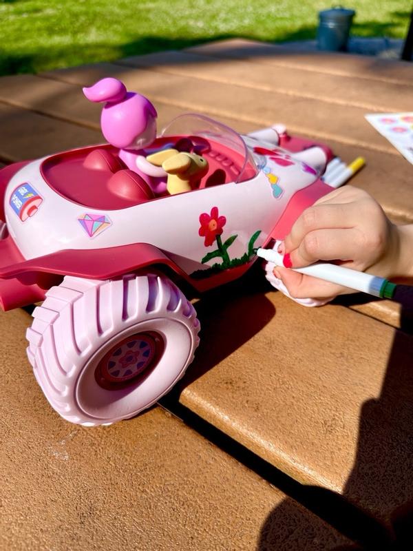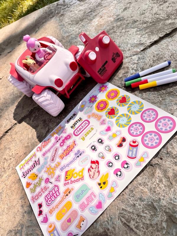 • With 4 erasable markers, over 50 stickers, and fun accessories including 3 wigs for the driver and Pixie the Dog, every design is a new adventure.